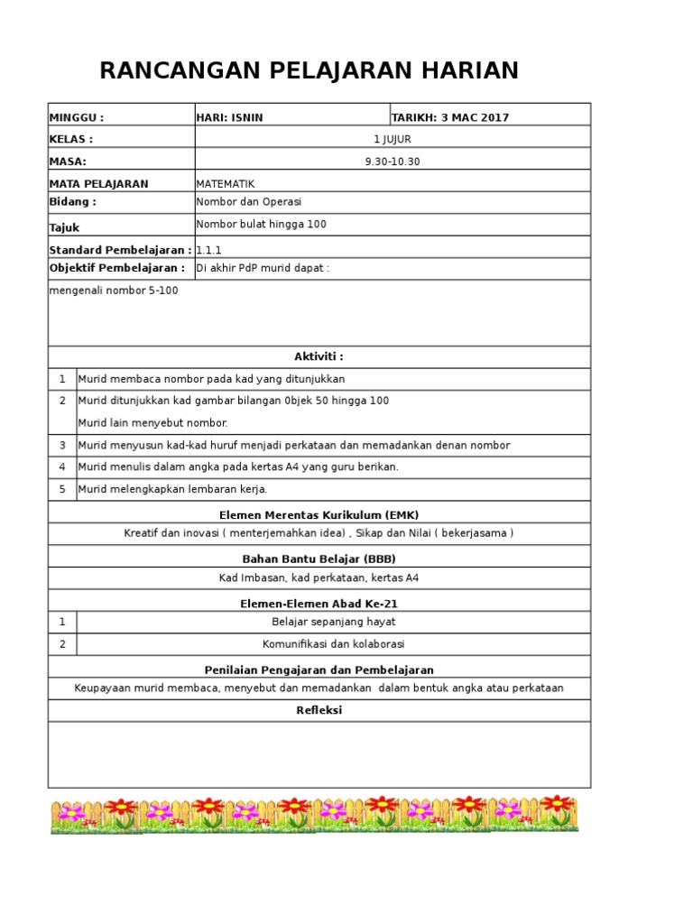 910 hingga 1010 am 60 minit Bilangan Murid. RPH Matematik Tahun 1 adalah Rancangan Pengajaran Harian yang perlu disediakan lebih awal oleh guru sebelum menjalankan sesi pegajaran dan pembelajaranRancangan Pengajaran Harian ini dibina sebagai panduan para guru untuk mengajar dengan lebih sistematik dan efektif serta mampu untuk mencapai apa yang diobjektifkan dalam sesi pengajaran dan pembelajaran kelak.