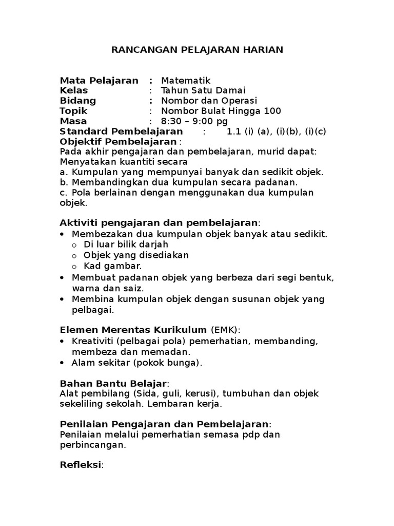 CONTOH RANCANGAN PENGAJARAN HARIAN MATEMATIK TAHUN 1 RANCANGAN PELAJARAN HARIAN Tanpa Program LINUS - Numerasi. Rph kssr nombor saya 1. Penilaian Pengajaran.