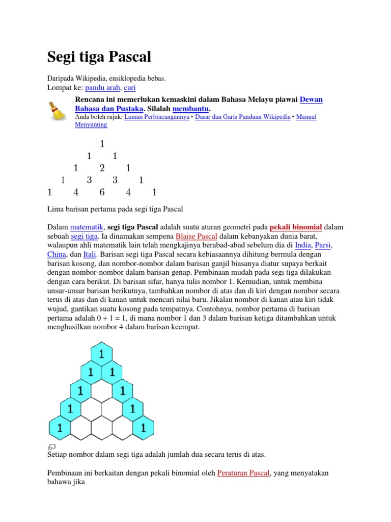 Dalam matematik segi tiga Pascal adalah suatu aturan geometri pada pekali binomial dalam sebuah segi tigaIa dinamakan sempena Blaise Pascal dalam kebanyakan dunia barat walaupun ahli matematik lain telah mengkajinya berabad-abad sebelum dia di India Parsi China dan ItaliBarisan segi tiga Pascal secara kebiasaannya dihitung bermula dengan barisan.